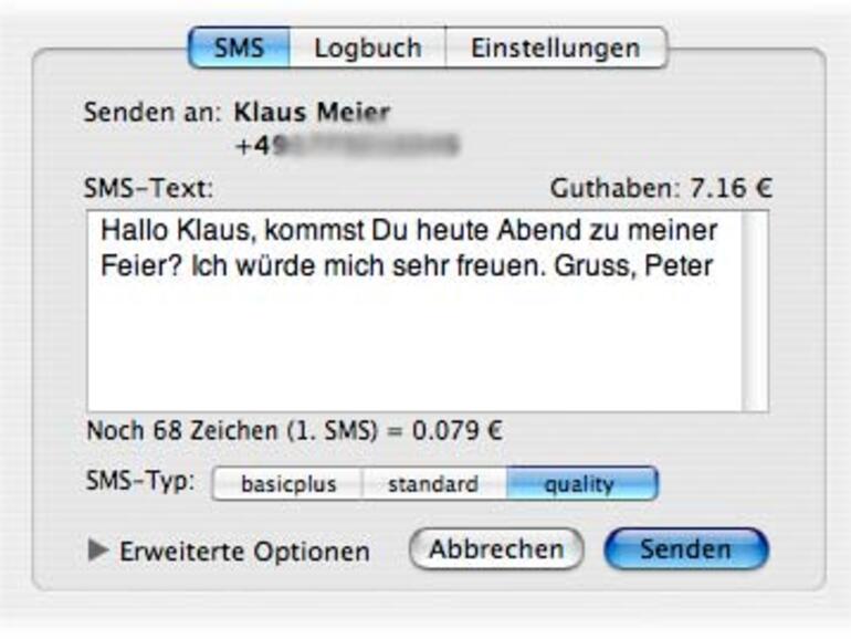 Dazu muss die unter Mac OS X 10.4 als Universal Binary laufende, kostenlose (Spenden erwünscht) Anwendung nur installiert werden, schon erscheint im Adressbuch mit Klick der rechten Maustaste auf die Handynummer ein Menü mit dem Eintrag "TheSMS senden an ...". Der komfortable SMS-Versand lässt in einem gesonderten Fenster nicht nur die Eingabe der Nachricht zu, auch der SMS-Typ kann frei gewählt werden, Guthabenstand und Zeichenzahl sind ablesbar und in einem Logbuch wird über die gesendeten SMSen Buch geführt. Durch die Schlüsselbund- und SSL-Unterstützung erfolgt der Rest einfach im Hintergrund. So kann mit dem Mac einfach und komfortabel der SMS-Versand durchgeführt werden.