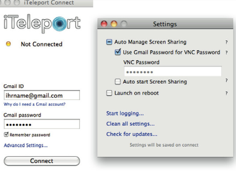 Laden Sie das kostenlose Programm iTeleport Connect von der Herstellerseite herunter. Anschließend verschieben Sie es in den Programme-Ordner und starten die Anwendung per Doppelklick. Ein Symbol in der Systemleiste zeigt den Start an.