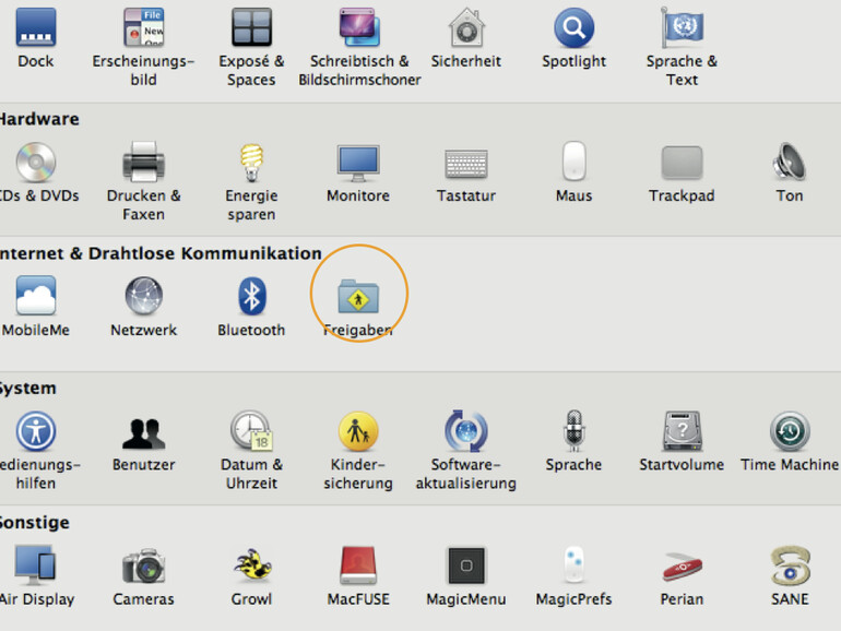 Nun müssen Sie Ihren Mac so einrichten, dass dieser den Zugriff vom iPad aus erlaubt. Gehen Sie hierfür in die Systemeinstellungen. Wählen Sie anschließend in der Kategorie Internet & Drahtlose Kommunikation das Register Freigaben aus.