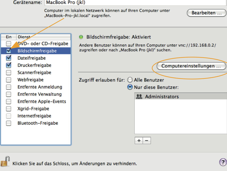 Setzen Sie in der linken Spalte einen Haken vor den Punkt Bildschirmfreigabe. Im rechten Teil des Fensters klicken Sie den Knopf Computereinstellungen … und vergeben im sich öffnenden Fenster ein Passwort für den Zugriff.