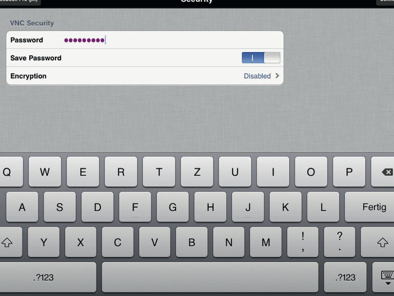 Klicken Sie auf dem iPad in der App iTeleport Connect auf Connect. In der iPad-App taucht der Mac nun im Register Discovered auf. Wählen Sie den kleinen blauen Pfeil am Ende der Spalte und im folgenden Fenster Security aus. Hier geben Sie das zuvor vergebene Passwort ein.