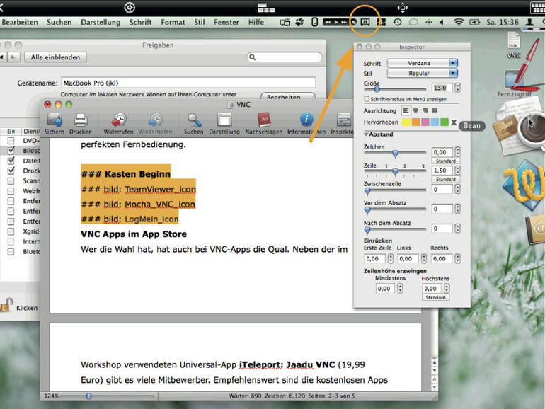 Über einen Klick auf Connect in der rechten oberen Ecke verbinden sich iPad und Mac. Nach einer kurzen Animation wird der Bildschirminhalt des Mac auf das iPad gespiegelt. Das Fernglas-Symbol in der Systemleiste zeigt an, dass der Fernzugriff aktiv ist.
