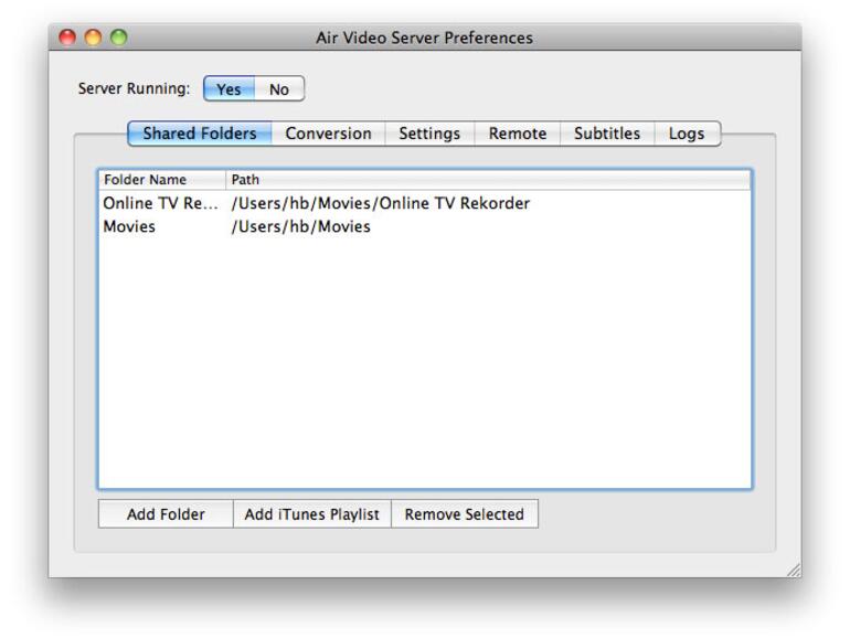 Laden und installieren Sie zunächst die Software Air Video Server. Die Software AirFlick greift auf Air Video zurück, um Videos „live“ in ein Apple TV kompatibles Format zu konvertieren. Nach der Installation nistet sich der Air Video Server in der Menüzeile ein. In den Einstellungen („Preferences“) finden Sie die Möglichkeit, unter „Shared Folders“ Filmordner hinzuzufügen, auf die Air Video zugreifen darf („Add Folder“).