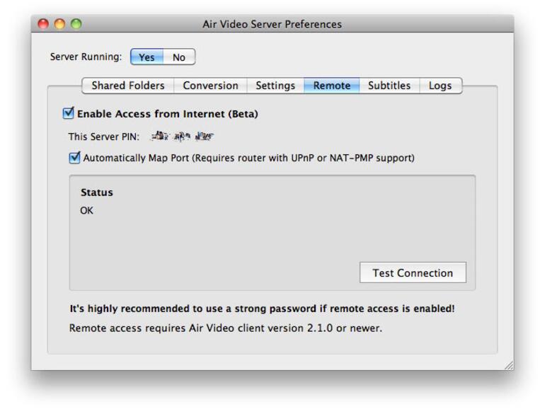 Wenn Sie in den Einstellungen des Air Video Servers unter „Remote“ den Punkt „Enable Access from Internet (Beta)“ anhaken, können Sie in diesem Fenster die PIN Ihres Air Video Servers ablesen. Diese benötigen Sie, um mit AirFlick später auf den Air Video Server zuzugreifen.