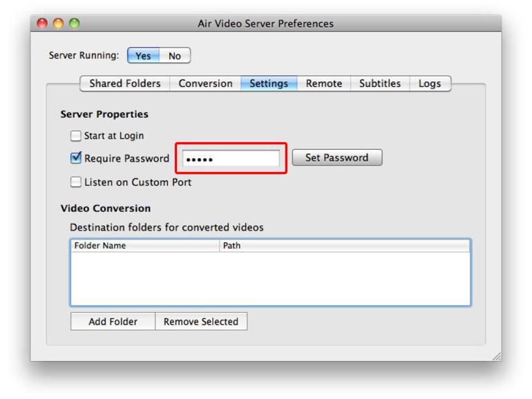 Vergeben Sie unter „Settings“ ein Passwort für den Zugriff auf den Air Video Server. Dies müssen Sie ebenfalls später in AirFlick eingeben. Besonders relevant ist die Vergabe eines Passwortes auch für den Zugriff auf Air Video über iPhone oder iPad, wenn Sie unterwegs sind.