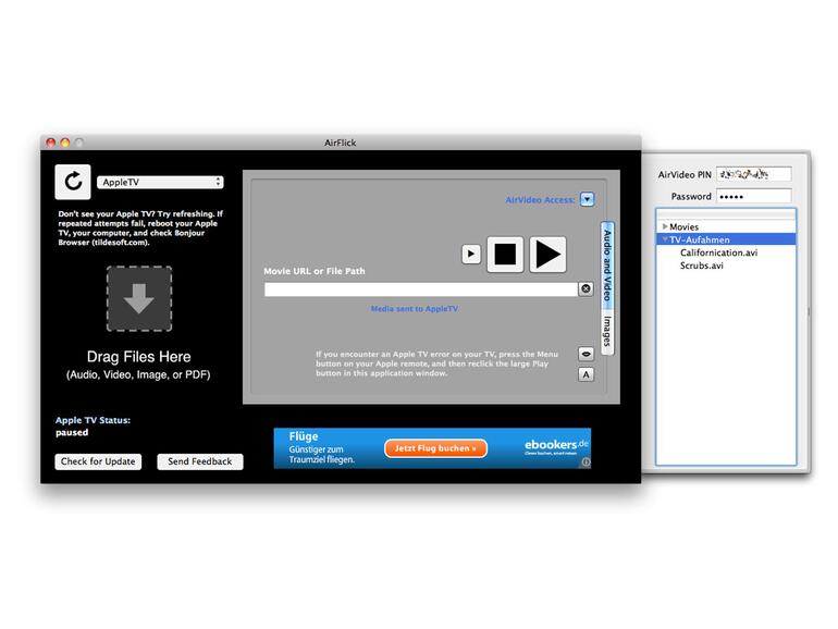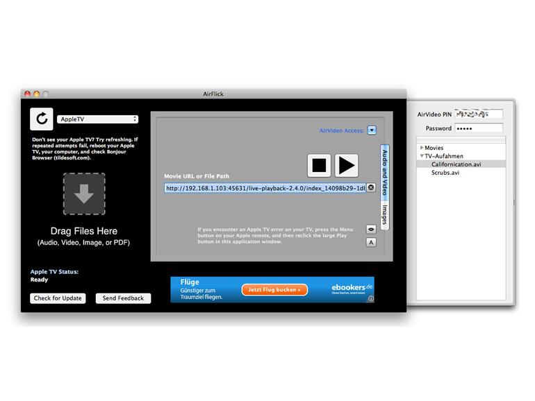 Haben Sie Passwort und PIN eingegeben, sollten im Seitenfenster Ihre in Air Video freigegebenen Filmordner erscheinen. Wählen Sie hier den gewünschten Film zur Wiedergabe über Apple TV aus und klicken Sie auf den schwarzen Wiedergabeknopf im AirFlick-Fenster. Film ab!
