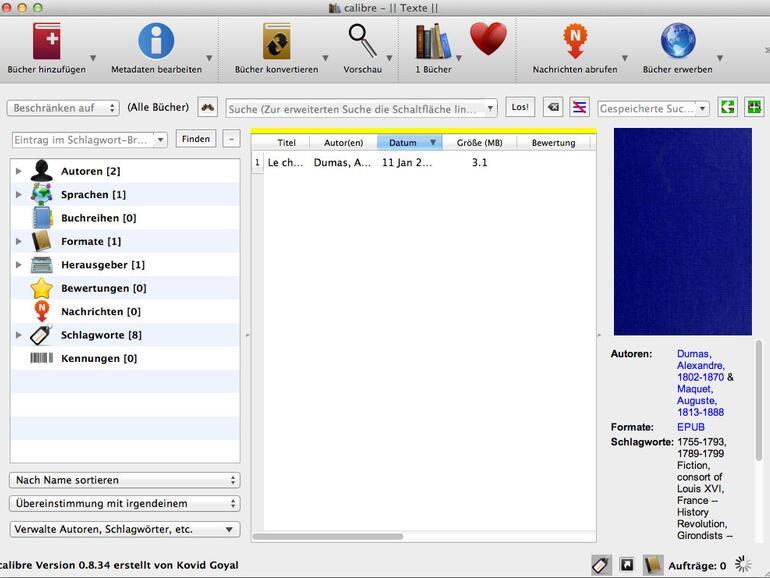 Calibre verwaltet mehrere Formate eines Dokuments, rechts in der Seitenleiste können Sie sehen, welche Formate verfügbar sind. Klicken Sie auf „EPUB“, Calibre wird nun den eigenen E-Book-Reader starten.