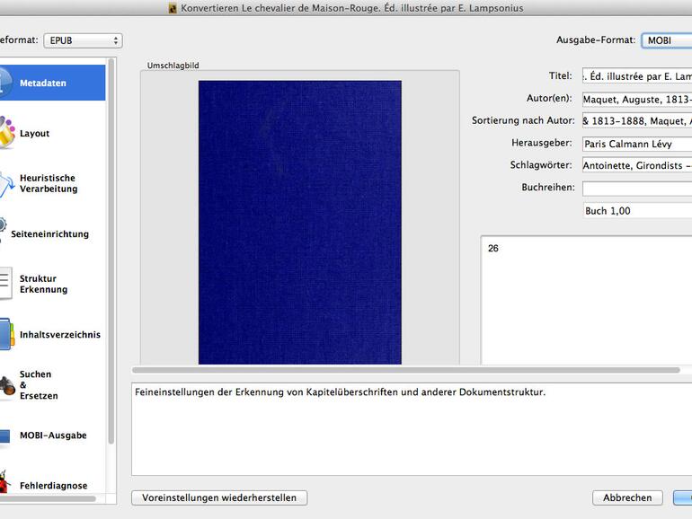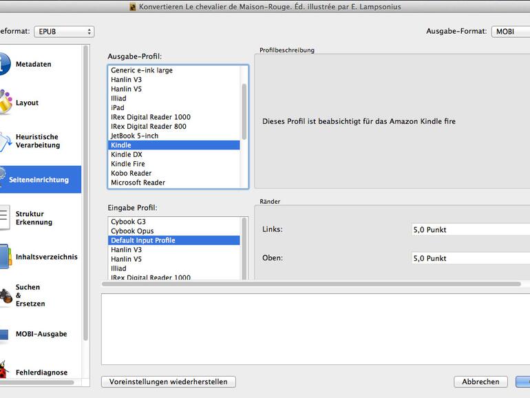 Auch dieser Dialog sieht komplizierter aus, als er eigentlich ist. Oben wird das Eingabe- und Ausgabeformat angegeben. In unserem Fall wird ein ePub-Dokument für den Kindle (Mobipocket) konvertiert.