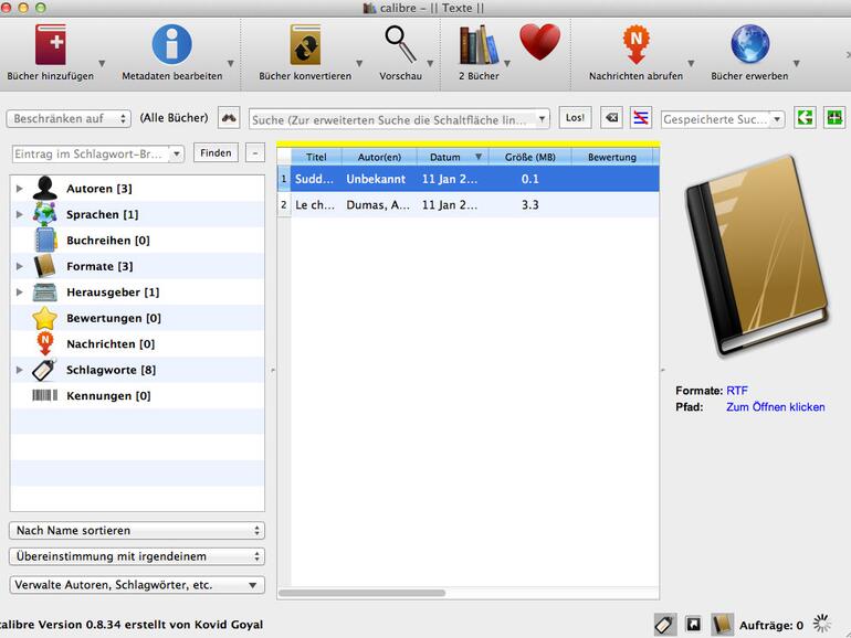 Calibre unterstützt viele Eingabeformate, darunter HTML, ODT, RTF und TXT. Hier soll ein RTF-Dokument in ein eBook konvertiert werden, es wird dazu zunächst wie ein Buch zur Calibre-Bibliothek hinzugefügt.