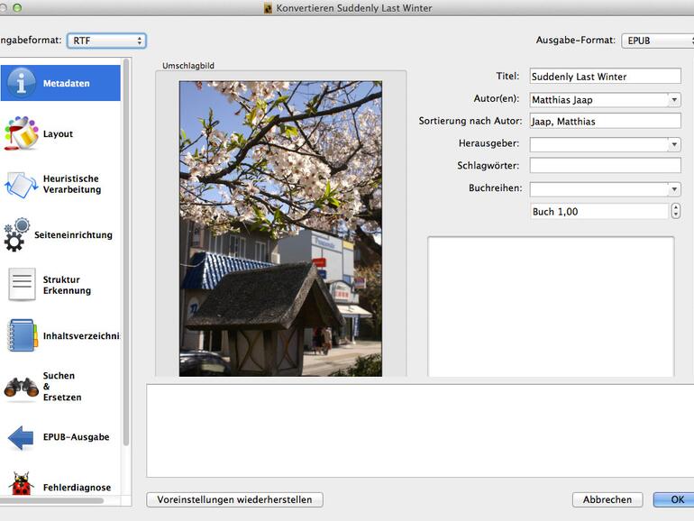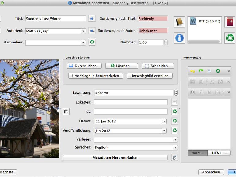 Der RTF-Datei fehlen noch ein paar Metadaten. Diese können entweder im Metadaten- oder Konvertieren-Dialog eingegeben werden. Mit einem Umschlagbild passt das spätere Buch optisch besser in das virtuelle Buchregal.