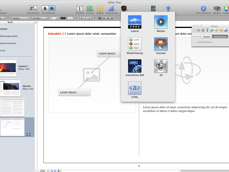 Über den Widget-Browser kann dem iBook etwas Interaktivität verliehen werden