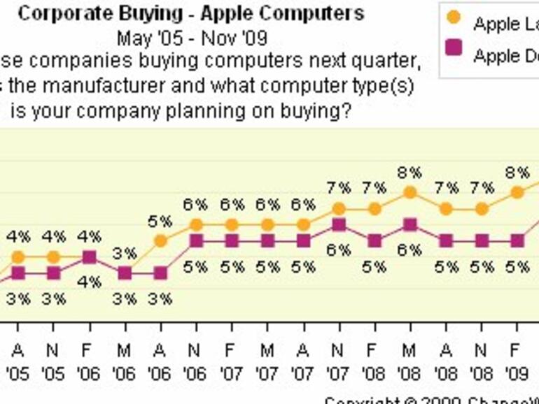 Windows 7 habe aber anscheinend keine negativen Auswirkungen auf die Apple-Verkäufe an Unternehmen. Im Gegenteil, mit geplanten zehn Prozent Laptop- und sieben Prozent Desktop-Käufen im ersten Quartal erzielt Apple im Unternehmensbereich ebenfalls einen neuen Höchstwert.
