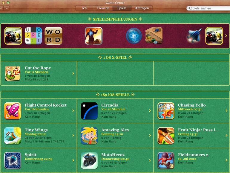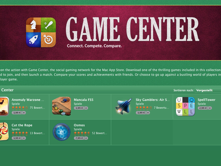 Sechs Spiele (Anomaly Warzone, Mancala F55, Sky Gamblers, SpellTower, Cut the Rope, Osmos) zeigt die Game-Center-Seite nun an. Apple verweist auf diese Seite jedoch noch nicht, sondern weist bei den Promo-Bildchen auf die Game-Center-Optimierung hin. Anders als im iOS App Store gibt es im Mac App Store noch kein Game-Center-Icon auf den Programmseiten.