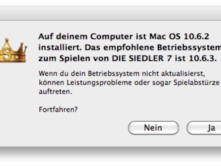 Die Überraschung ist, dass mindestens Mac OS X 10.6.2 benötigt wird. Wer den aktuellen Snow Leopard installiert hat, bekommt dennoch eine Warnmeldung, dass das empfohlene Betriebssystem zum Spielen von Die Siedler 7 Mac OS X 10.6.3 ist. Es ist derzeit noch nicht bekannt, ob Cider zur Portierung benutzt wurde. Der Verdacht liegt nahe, erste Berichte sprechen von nur mäßiger Performance.