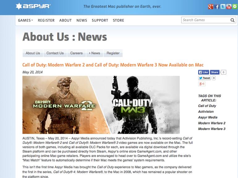 Call of Duty: Modern Warfare 3 wird derzeit in Aspyrs eigenem Webshop GameAgent mit dem Vermerk „Deal Alert!“ für 31,90 statt normalpreisigen 42,54 Euro angeboten. Modern Warfare 2 wird hingegen in Deutschland von GameAgent explizit nicht angeboten. Auch Application Systems Heidelberg bewirbt nur das Erscheinen des neueren Titels. Das aktualisierte Steam-Angebot der Reihe Call of Duty inklusive aller auch für den Mac verfügbarer Zusatzinhalte findet sich hier.