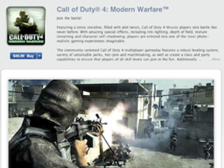 Wie TechCrunch berichtet ist der Ego-Shooter im US Mac App Store zu einem Preis von knapp 50 US-Dollar erhältlich. Für dieses Spiele-Genre sei es ein üblicher Preis. Jedoch wird der Titel über amazon.com auch schon billiger angeboten. Möglicherweise hat Apples Anteil von 30 Prozent Einfluss auf die Preisgestaltung. Call of Duty 4: Modern Warfare ist ein von Infinity Ward entwickelter Ego-Shooter. Die Kriegsschauplätze liegen im nahen und mittleren Osten. Das Spiel wurde am 8. November 2007 über Activision veröffentlicht. Es handelt sich um den vierten Teil der Call of Duty-Reihe, der sich 2008 über 13 Millionen Mal verkauft haben soll.