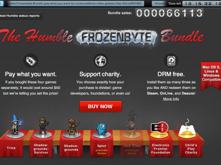 Noch knappe zwei Wochen läuft der Timer dieser Wohlfahrtsaktion, die mit Trine, Shadowgrounds und Shadowgrounds: Survivor drei DRM-freie Indie-Spiele für Mac/Win/Linux ab 1 US-Dollar zusammenbündelt. Der Bonus-Titel Jack Claw wurde vor der Veröffentlichung von Frozenbyte eingestellt, läuft nur unter Windows und versteht sich als Prototyp. Splot befindet sich noch in Entwicklung und wartet bisher nur mit Concept Art auf. Der Kauf des Bundles beinhaltet die Vorbestellung für diesen Titel.