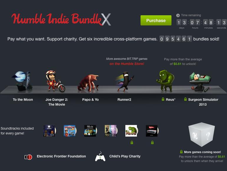 Mit Reus und Surgeon Simulator 2013 sind zwei Spiele nur im Paket enthalten, wenn der Käufer mehr als die als Durchschnitt ermittelten 5,61 US-Dollar zahlt. Soweit verfügbar, sind sogar die Soundtracks der Titel im Download-Umfang.