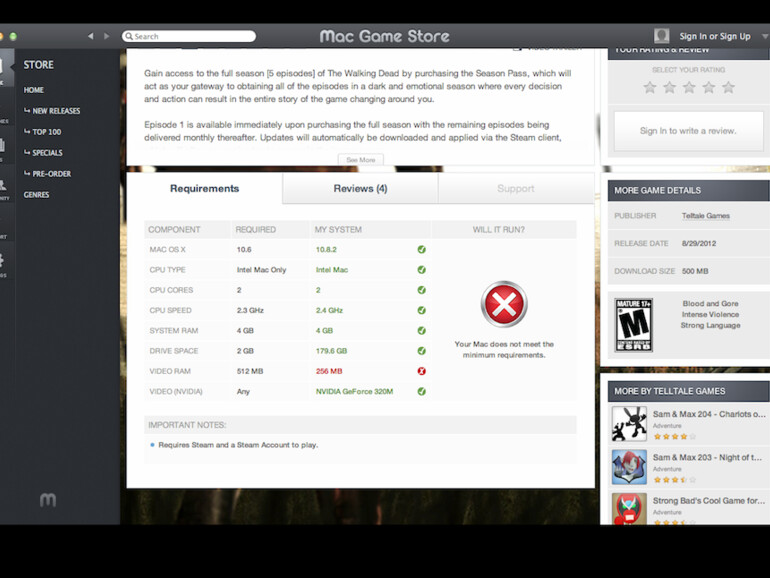 MacGameStore.com lässt die Verwaltung aller Spiele einfach über die App zu. Es gibt einen integrierten Kompatibilitäts-Checker, der warnt, falls ein ausgewähltes Spiel sich nicht am Mac des Nutzers spielen lässt. Außerdem kann man vorab Demos laden und ausprobieren.