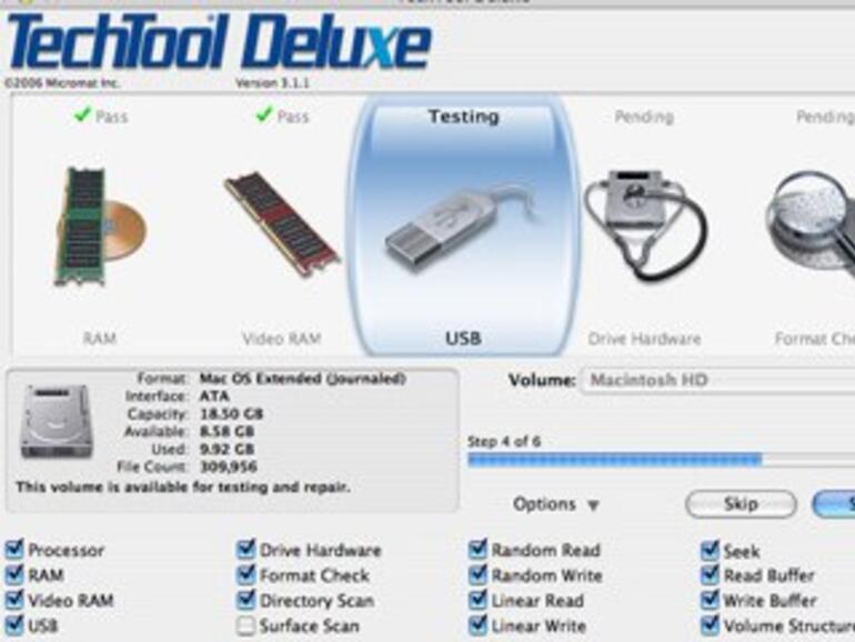Das leistungsstarke Diagnosedienstprogramm TechTool Deluxe von Micromat ist als Teil des AppleCare Protection Plan einem Update unterzogen worden. Mit dieser schon seit vielen Jahren bekannten Software lassen sich die grundlegenden Systemkomponenten eines Computers testen. Vom Prozessor über RAM und VRAM bis zur Festplatte.