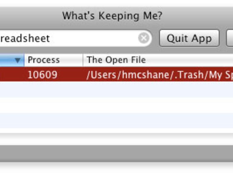 Die um eine Spende von 5 US-Dollar für die Anwendung bittenden Entwickler wollen den Nutzern dabei helfen, das mit dem Dokument noch arbeitende Programm ausfindig zu machen und es zu beenden. Einfach den Namen des Dokuments eintippen und schon findet das Programm den Störenfried. Dieser lässt sich dann notfalls auch über "What's keeping me?" abschießen bzw. "sofort beenden".