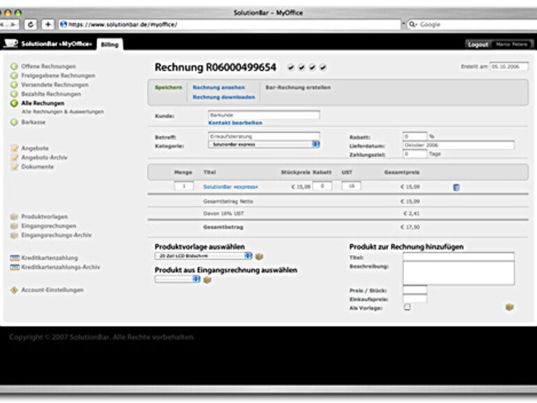 Der User benötige für das webbasierte Tool nur die Zugangsdaten – und kann SolutionBar »MyOffice« sofort ohne Installation benutzen. Das System funktioniert unabhängig von Betriebssystem, Server und Standort: So könne der findige Kleinunternehmer zum Beispiel auch unterwegs, am Flughafen oder im HotSpot-Café Rechnungen schreiben und im PDF-Format verschicken. Fürs tägliche Backup der sensiblen Daten sei somit auch endlich gesorgt.