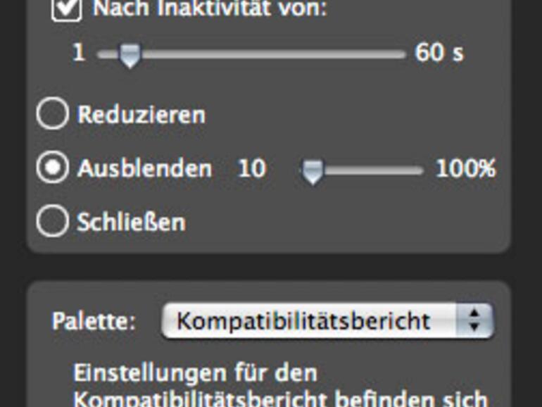 Microsoft hat die Toolbox in Word 2011 zugunsten der Menübänder abgespeckt. Dennoch ist sie weiterhin Bestandteil des Programms und erlaubt den Zugriff auf die Formatvorlage, Zitate, Scrapbook, Referenztools und Kompatibilitätsbericht. Etwas versteckt ist die Möglichkeit, die Toolbox anzupassen. Klicken Sie auf den Pfeil in der rechten oberen Toolbox-Ecke. Nun lässt sich bestimmen, ob Word das Fenster nach einer bestimmten Zeit ausblendet, reduziert oder schließt. Außerdem können Sie einen Online-Zugriff erlauben und die Bereiche bestimmen, die die Referenztool-Ansicht darstellen soll. Die Palette Kompatibilitätsbericht wird in den Word-Einstellungen individualisiert.