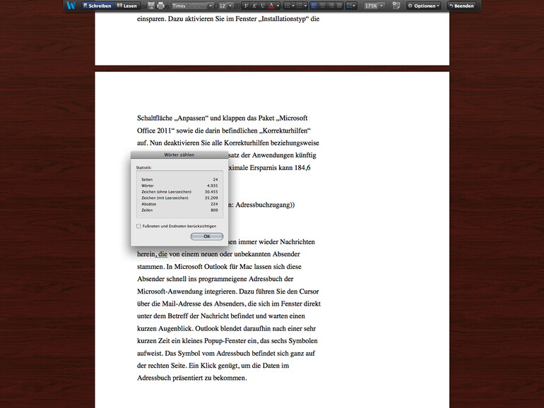 Die Vollbildansicht ist für konzentriertes Arbeiten eine gute Wahl. Jedoch verliert man schnell die Übersicht, wie viel oder wenig Text bereits geschrieben ist. Das lässt sich ändern, in dem Sie die Option „Zeichen zählen“ mit einem Tastenkürzel versehen. Dazu navigieren Sie über das Menü „Extras“ zur Option „Tastatur anpassen …“. Markieren Sie in dem Fenster die Kategorie „Extras“ und scrollen Sie rechts zu dem Befehl „ExtrasWörterZählen“. Markieren Sie den Befehl. Nun weisen Sie er Option eine Tastenkombination zu, indem Sie das Feld „Neue Tastenkombination drücken:“ aktivieren und die von Ihnen gewählten Tasten betätigen. Falls die Kombination bereits vergeben ist, weist Word Sie darauf hin und Sie können eine Alternative aussuchen. Bestätigen Sie die endgültige Wahl. Ist die Aktion abgeschlossen, lässt sich das Geschriebene auszählen, auch wenn Sie sich im Vollbildmodus befinden, denn Word zeigt das Ergebnisfenster „Wörter zählen“ über der Textdarstellung des Vollbildmodus an.