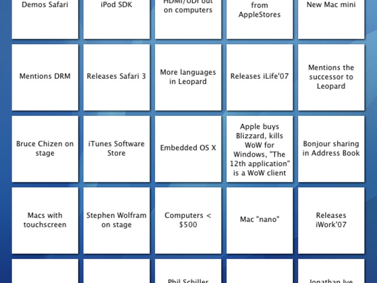 Beim Start des Spiels muss eine beliebige Zahl eingegeben werden, um den Zufallsgenerator zu initialisieren, dann heißt es während der Keynote aufgepasst und die zutreffenden Felder anklicken. Wer tatsächlich fünf Felder diagonal, vertikal oder horizontal zusammenbekommt, hat gewonnen und bekommt - gar nichts.