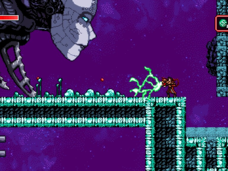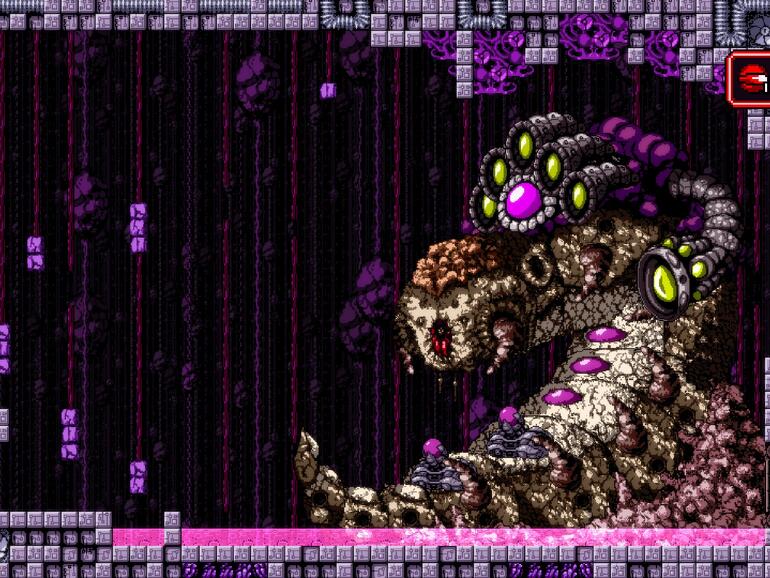 Neben dem an das Finden neuer Ausrüstungsgegenstände gekoppelten Fortschritt bei der Erkundung der Spielewelt bedient „Axiom Verge“ auch andernorts gelungen die Genre-Konventionen: Was wäre eine Hommage an Spiele wie „Metroid“, „Super Probotector“ und „Blaster Master“ ohne epische Bosskämpfe?