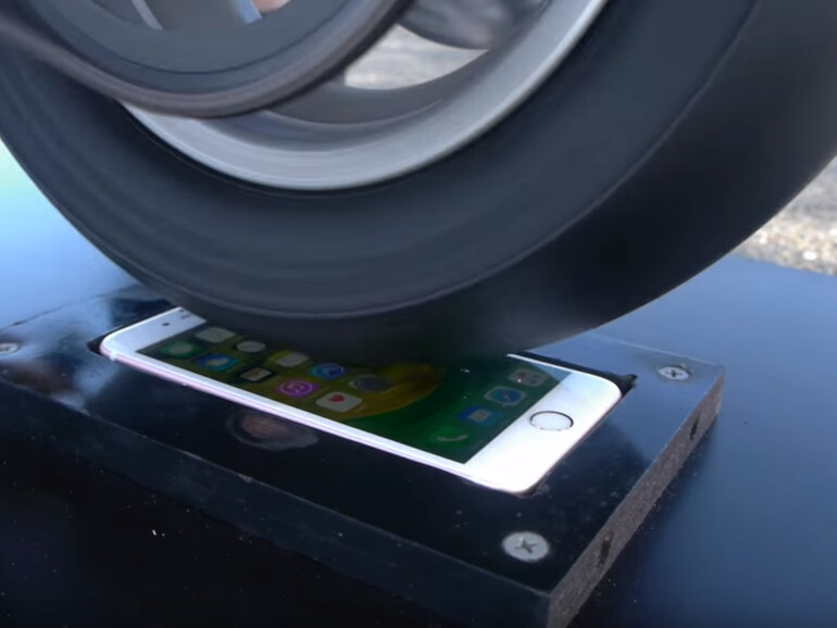 Unser erstes Video ist das einzige, das die Zerstörung eines iPhones zeigt, wie sie möglicherweise auch annähernd in der Realität vorkommen könnte. So ist ein Reifen dazu in der Lage, sich durch das Display zu schleifen. Die Zerstörung ist aber nicht vollständig. Wahrscheinlich reicht es, das Display-Modul auszutauschen und das iPhone ist so gut wie neu.