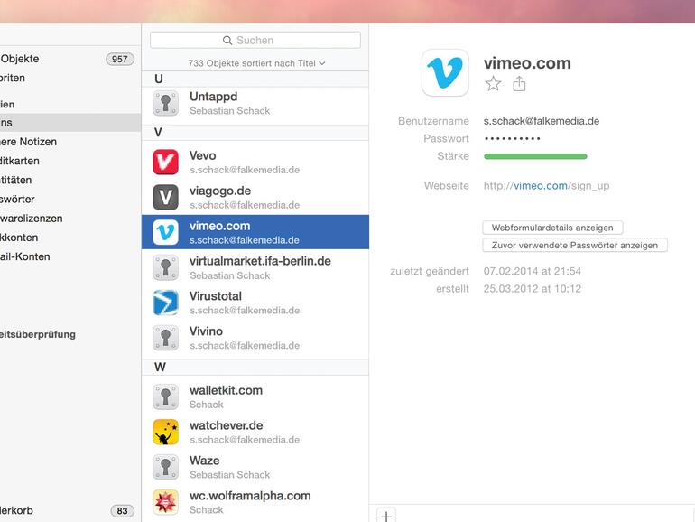 Passwort-Verwaltung: Apple hat den eigenen Schlüsselbund mit Mavericks und Yosemite deutlich aufgewertet. Neue Passwörter werden direkt in Safari vorgeschlagen, gespeicherte können über alle Geräte synchronisiert werden. Wozu also etwas anderes verwenden? Ganz einfach: 1Password bietet einfach mehr! Natürlich kann man in 1Password auch Passwörter generieren – und das sogar individueller als mit dem OS-X-Schlüsselbund. Darüber hinaus bietet 1Password aber eine ausgefeilte Browser-Integration, eine extrem starke Verschlüsselung und viele weitere Komfort-Funktionen. Beispielsweise das Teilen von Vaults genannten Passwort-Sammlungen mit Familienmitgliedern oder Arbeitskollegen. „Watchtower“ ist eine Funktion, die Sie darauf hinweist, wenn eine Seite, für die Sie einen Login hinterlegt haben, unlängst „Sicherheitsprobleme“ hatte, so dass Sie Ihr Passwort vielleicht ändern möchten. Genial!