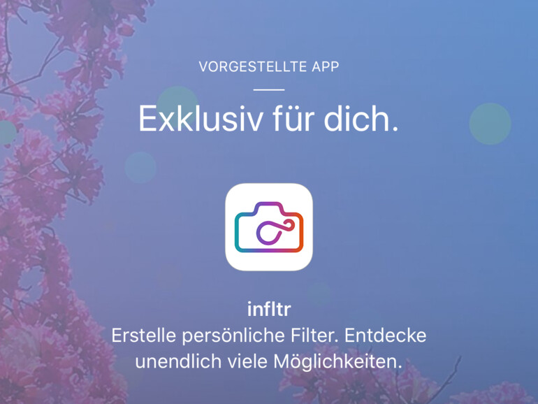 Anleitung: Laden Sie sich zunächst die „Apple Store“-App aus dem App Store herunter. Sobald der Download abgeschlossen ist, starten Sie die App. Scrollen Sie im Reiter „Entdecken“ nach unten, bis sie den blauen Aufmacher mit dem Text „Exklusiv für dich“ sehen. Dort befindet sich eine kleine Grafik, die Ihnen kurz die Funktionen von infltr vorstellt. Tippen Sie auf die Grafik
