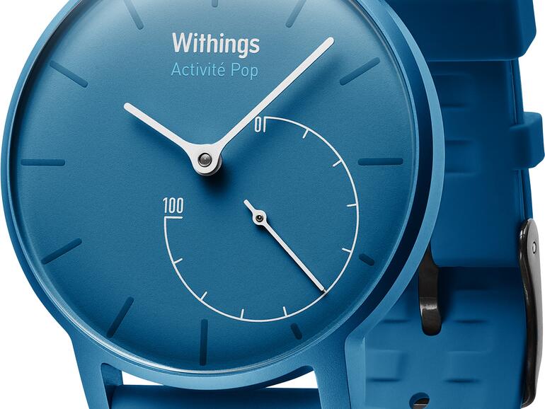 Die Activité Pop, das neueste Modell des Herstellers Withings, sieht auf den ersten Blick aus wie eine normale Armbanduhr und hat anstelle eines Displays ein analoges Ziffernblatt, das die Zeit anzeigt. Jedoch signalisiert ein zusätzliches, kleineres Ziffernblatt, wie viel Prozent des täglichen Schrittpensums erreicht wurden. Die genauen Daten der Smartwatch können nach der Synchronisation mit der Health-Mate-App von Withings auf dem iPhone nachgeschaut werden. Leider gibt es in dieser keine Möglichkeit, individuell ein tägliches Schrittpensum einzustellen. Zudem überwacht die Smartwatch die Schlafqualität und weckt mit einem Vibrationswecker. Positiv hervorzuheben ist, dass die Uhr zum einen wasserfest und die Batterie der Activité Pop bis zu acht Monate halten soll.