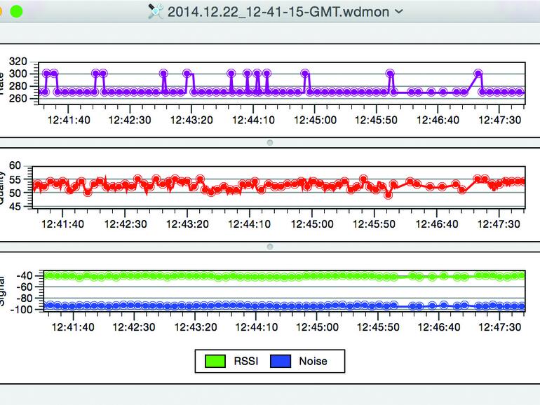 Unter Yosemite klicken Sie dazu auf die Fenster-Leiste von „Diagnose für drahtlose Umgebungen“ und dann auf „Leistung“. Je nachdem, welche OS-X-Version bei Ihnen läuft, sehen Sie dann einen oder mehrere Balken. Unter OS X Yosemite sind es drei: einer zeigt die Übertragungsrate, ein weiterer die Signalstärke, und der dritte die verschiedenen Signale und das Signalrauschen. Um ein zuverlässiges Signal zu erhalten, sollte die Signalstärke irgendwo zwischen -60 und -10dBm und der Geräusch-Level unter -75dBm liegen. Je kleiner der Abstand zwischen Signal und Geräusch, desto wahrscheinlicher ist es, dass das Signal Interferenzen ausgesetzt ist.