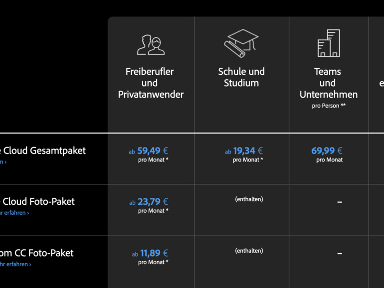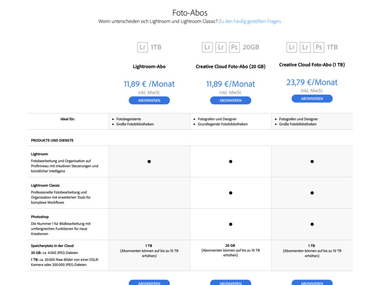 Update vom 06.05.2019: Inzwischen hat das Adobe-Presseteam Stellung zu der Preisänderung genommen: „Bei den in der vergangenen Woche auf adobe.com angezeigten Preisen hat es sich um einen Testlauf gehandelt. Dieser ist beendet, an den Preisen / an dem Umfang des Foto-Abos hat sich nichts geändert.“