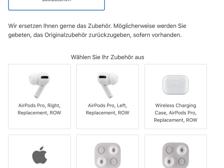 Es ist mit einem Preis von 3,5 Euro für zwei Ohreinsätze deutlich günstiger, wenn man sich an den Apple Support wendet. Dort wählt man „AirPods“ aus. Danach wählt man aus, dass man „fehlende oder verloren gegangene AirPods“ aus, bevor du „Ohreinsätze der AirPods Pro austauschen“ anklickst. Danach geht es mit „Ersatz bestellen“ weiter. Gib unten die Seriennummer der AirPods Pro ein. Diese findest du im Deckel des Ladecases rechts unten. Anschließend kannst du die richtige Größe auswählen und fährst wie üblich mit der Bestellung fort.