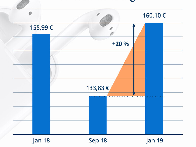 Im ersten Jahr nach der Veröffentlichung der AirPods blieben die Preis weitestgehend stabil. Mit aufkommenden Gerüchten um eine zweite Generation fielen dann auch die Preis im September 2018 auf ein Tief von etwa 130 Euro. Allerdings sorgte die große Nachfrage dann wieder für einen deutlichen Anstieg vo knapp 20 Prozent, sodass sich die Preise wieder bei etwa 160 Euro einpegelten. Eine solche Preissteigerung ist sehr ungewöhnlich für ein Produkt, das mehr als zwei Jahre auf dem Markt ist und für das in den kommenden Monat ein Nachfolger erwartet wird. Experten gehen davon aus, dass es bereits Ende März das drahtlose Ladecase geben könnte, während die zweite Generation im Herbst erwartet wird.