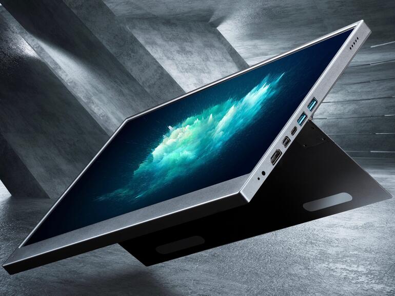 Das Gemini erinnert optisch an ein Tablet wie das Microsoft Surface. Grund ist der Kickstand, mit dem das Gerät auf dem Tisch so aufgestellt wird, dass es aus einem sinnvollen Winkel abgelesen werden kann. Das Gemini erlaubt sogar unterschiedliche Aufstellwinkel. Das Display verfügt über zahlreiche Anschlüsse, darunter auch USB-C. Und hier wird es auch für Besitzer neuer MacBook Pro interessant. Es gibt zwar auch andere portable Displays, aber dieser Anschluss ist noch recht selten.