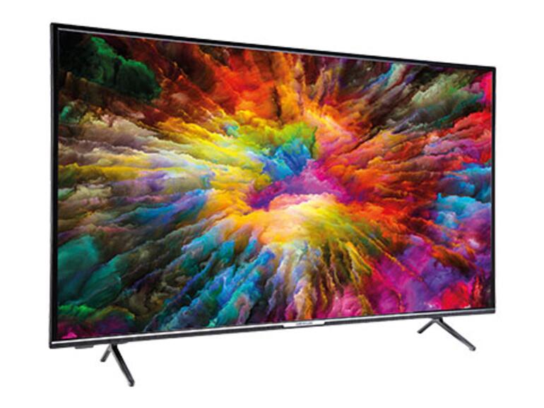 Der Fernseher mit einer gigantischen Bildschirmdiagonale von 163,8cm (65 Zoll) ist vom 24.09.2020 bis 17.10.2020 erhältlich. Seine Auflösung liegt bei 4K, also 3.840 x 2.160 Pixel. Der statische Kontrast des Panels wird mit 1:2.000 angegeben, der dynamische Kontrast mit 27.000:1. Mit einer Helligkeit von 350 Candela pro Quadratmeter ist das Bild allerdings deutlich dunkler als das von konkurrierenden Modellen namhafter Hersteller, doch die sind eben auch teure. Was bedeutet das in der Praxis? Zunächst einmal ist es besser, das Zimmer in dem der Fernseher steht etwas abzudunkeln - grelles Sonnenlicht dürfte das Fernseherlebnis deutlich mindern, weil dann die Hintergrundbeleuchtung überstrahlt wird.