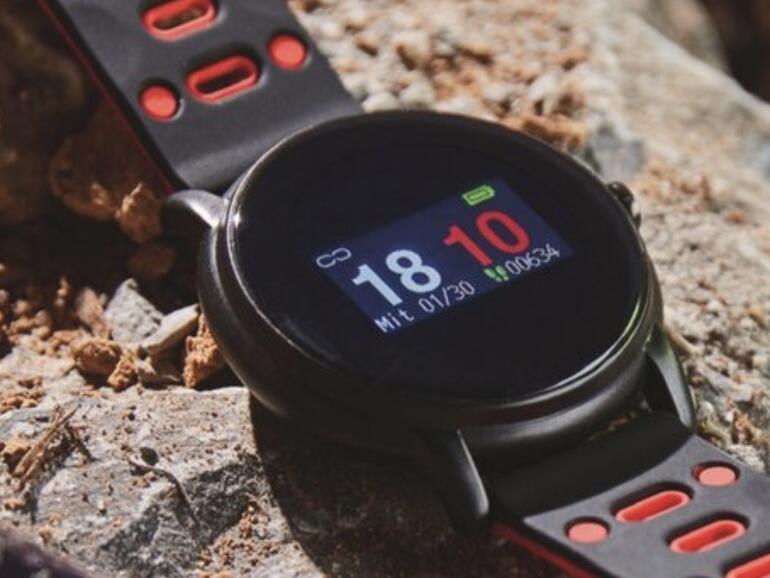 Die Smart Watch Sempre ist rund und zeigt die Zeit mit Ziffern in Weiß und Rot an. Die Akkulaufzeit wird mit bis zu 7 Tagen angegeben. Das Touch-Display ist allerdings kein OLED, sondern ein 0,96 Zoll großes TFT-Display. Die Uhr ist nach Schutzklasse IP68 spritzwassergeschützt. Regen und Staub machen ihr nichts aus.
