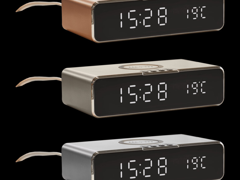Aldi Süd und Aldi Nord bringen jeweils am 27. April 2020 ein Aktionsangebot auf den Markt. Die Tischuhr mit QI-Ladestation. Dabei handelt es sich um ein recht flaches Gerät in drei verschiedenen Metallic-Tönen. Silber, Gold und Rotgold - wie gemacht für die meisten iPhones.