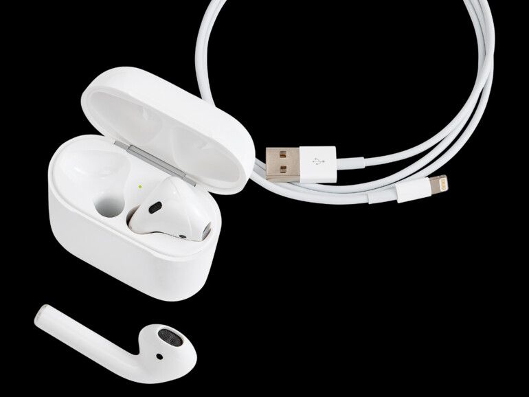 Die AirPods der zweiten Generation werden mit einem Ladecase verkauft. Das kann per Lightning aufgeladen werden. Die LED auf der Vorderseite des Case zeigt an, dass die AirPods laden.