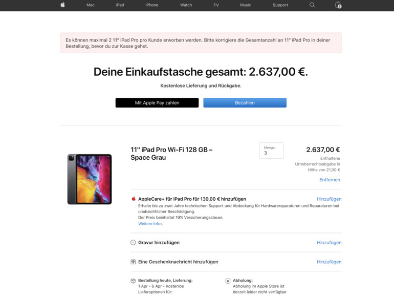 Konkret heißt das, dass man im Apple Online Store nur maximal zwei 11" iPad Pro mit einem Bezahlvorgang kaufen kann. Allerdings können dem Warenkorb noch weitere Produkte wie zwei iPhone 11 Pro oder auch zwei neue MacBook Air hinzugefügt werden. Wichtig ist dabei, dass es sich um unterschiedliche Geräte handelt.