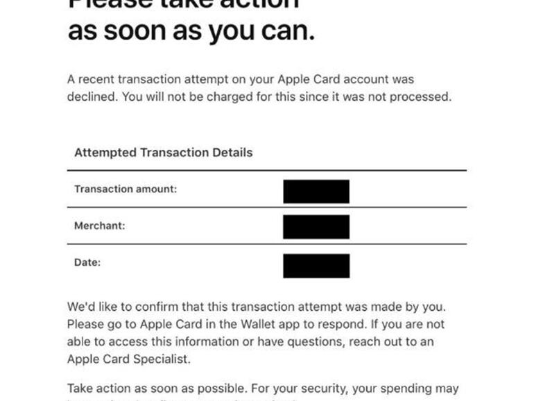 Sollte Apple eine Unregelmäßigkeit erkannt haben, dann werden Sie darüber umgehend in Kenntnis gesetzt. Sie erhalten die Aufforderung, dass Sie umgehend handeln sollten, während die betrügerische Transaktion nicht vollzogen wird. In dem Fall wird die Apple Card bei der Bezahlung abgelehnt. Das Schreiben gibt Ihnen zusätzlich Aufschluss über die Höhe des Betrags, den Händler sowie das Datum.