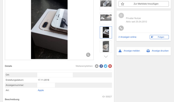 - Achten Sie außerdem darauf, seit wann der Verkäufer auf der Plattform aktiv ist. Wenn er sich erst „gestern“ angemeldet hat, sollten Sie skeptisch herangehen. Schauen Sie außerdem, ob der Händler noch andere Anzeigen anbietet, um eventuell ein Schema zu erkennen.
