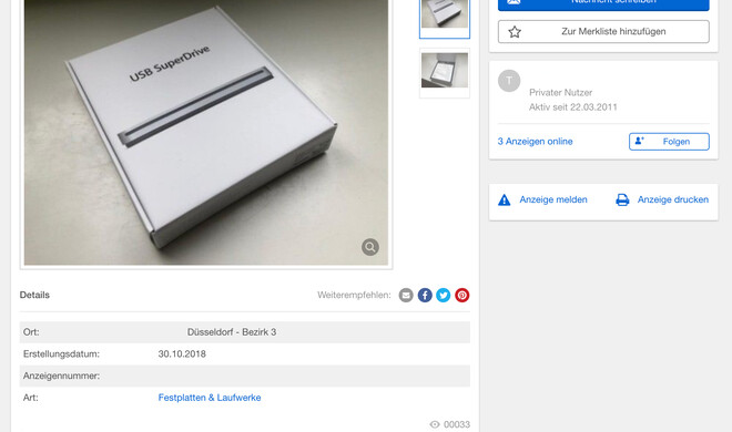 Sie möchten ein einmal benutztes SuperDrive von Apple kaufen? In Düsseldorf bietet es Ihnen jemand zum Preis von 80 Euro an. Sie könnten es allerdings auch inklusive Versandkosten einfach für deutlich unter 80 Euro online neu kaufen, wie der Preisvergleich zeigt. Ein weiterer Fall von unrealistischer Preisvorstellung.