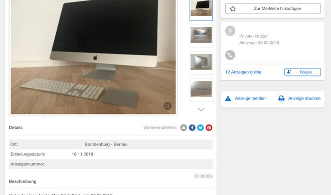 Dieser Anbieter aus Brandenburg möchte seinen iMac unbedingt loswerden, denn er hat das Gerät sogar inseriert bei eBay-Kleinanzeigen, damit es auf Suchseiten ganz weit oben landet.