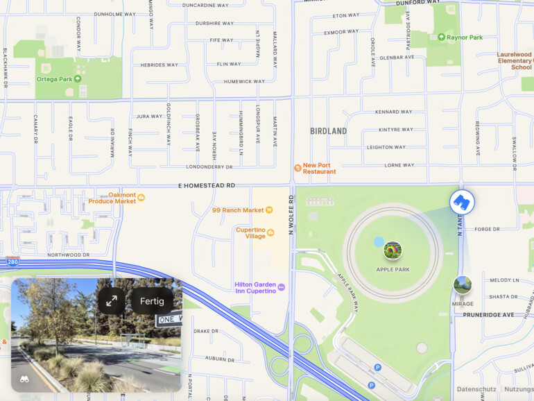 Look Around ist eine Funktion von Apple Maps, die es Nutzern ermöglicht, 360-Grad-Straßenansichten von Städten und Orten zu erkunden. Ähnlich wie Google Street View bietet es hochauflösende Bilder auf Straßenebene. Mit Look Around können Nutzer virtuell durch Straßen navigieren und sich einen realistischen Eindruck von Geschäften, Sehenswürdigkeiten und Nachbarschaften verschaffen.