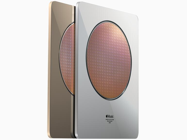In Form des neuen Verleih wird es neue exklusive Hardware geben: den Apple Music Award. Apple zufolge würdigt man damit die „handwerkliche Qualität der Musikproduktion“ und entwarf eine entsprechende Auszeichnung. Diese wurde aus einer Siliziumscheibe gefertigt, die zwischen einer polierten Glasscheibe und einem eloxierten Aluminiumgehäuse aufgehängt ist. „Der Award basiert auf einer perfekten 12-Zoll-Scheibe aus Silizium, deren Unebenheiten im Nanometerbereich liegen. Kupferschichten werden durch Ultraviolettlithographie aufgebracht und angeordnet, um Verbindungen zwischen Milliarden von Transistoren herzustellen. Das Ergebnis dieses mehrmonatigen Verfahrens, bevor der Wafer in Hunderte von Einzelchips geschnitten wird, ist atemberaubend und unverwechselbar. Durch diese symbolische Geste stehen die gleichen Prozessoren, die all die Geräte antreiben mit denen auf der ganzen Welt Musik gehört wird, im Mittelpunkt der Apple Music Awards.“